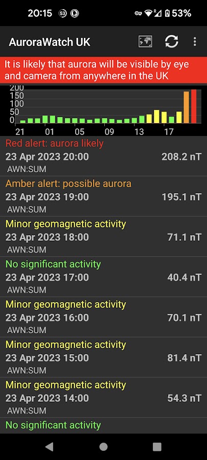Оповещения, предоставляемые Ланкастерским университетом, как правило, по умолчанию используют их Ланкастерский магнитометр для оповещения, хотя у них есть и другие; самое главное — на Шетландских островах. Естественно, вероятность увидеть полярное сияние на Шетландских островах выше, но поскольку эти данные (обычно) не используются, предупреждения немного более «пессимистичны». Это подходит для тех из нас, кто живет в Англии, но в меньшей степени для тех, кто живет дальше на севере.
