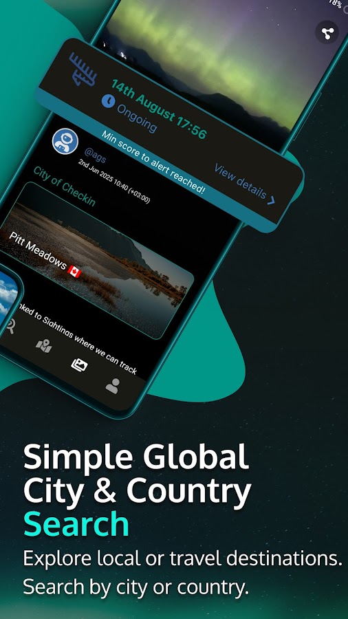 Пользователи могут исследовать и добавлять свои собственные отметки о полярных сияниях, которые они видели, мы также предупреждаем, если получаем отметку в вашем городе, чтобы поделиться опытом, но также гарантируем, что даже если мы не предупредим, вы получите уведомление от вашего сообщества охотников.