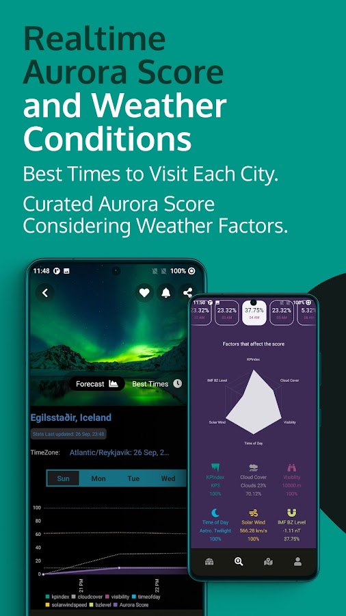 Приложение AuroraReach — это приложение для отслеживания, прогнозирования и оповещения о северном сиянии, которое дает локальные оценки видимости северного сияния для городов по всему миру. Мы учитываем погодные условия, такие как облачность, видимость, время суток и т. д., а также оценку полярного сияния, чтобы сгенерировать оценку, которая может помочь вам определить время видимости полярного сияния для заданного города. Наряду с полярным сиянием прогнозируются и погодные условия на срок до 4 дней.