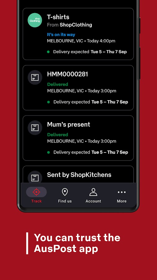 Приложение AusPost позволяет безопасно и легко отслеживать ваши посылки и управлять ими на вашем смарт-устройстве.