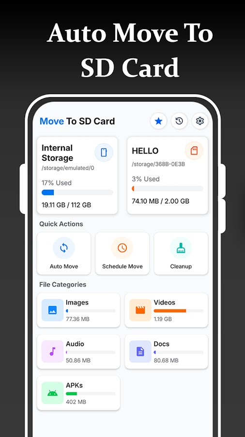 — Приложение помогает автоматически переносить файлы из внутренней памяти во внешнюю, экономя ваши усилия и время.