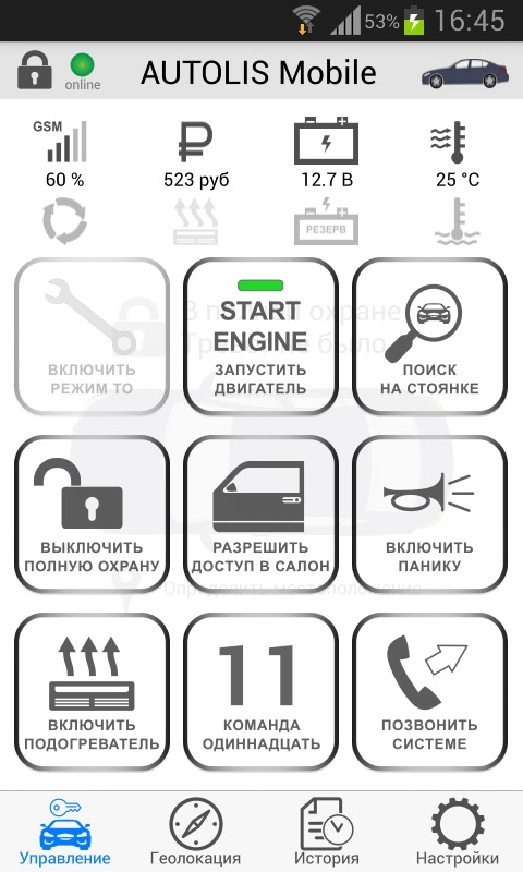 Раздел «Управление» является главным экраном приложения. При наличии связи приложения с сервером АВТОЛИС, в разделе отображаются: