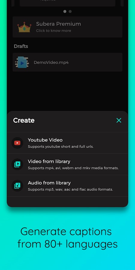Автоматический создатель и редактор титров/субтитров Subera. Вы можете создавать субтитры на более чем 85 языках и переводить их на более чем 100 языков. И быстро экспортируйте его в различные форматы, а также записывайте их на видео.