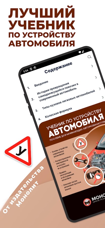 Приступая к работе над данным приложением, мы ставили перед собой цель в максимально доступной форме изложить достаточно непростой теоретический курс по устройству автомобиля. Знание основ строения транспортных средств снабдит начинающего водителя уверенностью в том, что он сможет контролировать ситуацию в случае какой-либо поломки, прогнозировать объем необходимых работ на СТО да и просто сможет грамотно эксплуатировать свое средство передвижения.