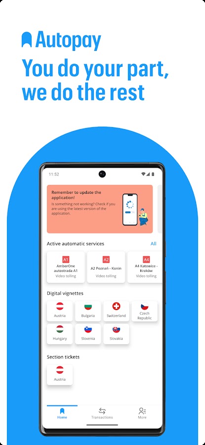 Autopay — это приложение для автоматической оплаты дорог, которым уже пользуются более 2 миллионов водителей. С ним вам больше не придется стоять в длинных очередях, чтобы купить виньетку или поднять шлагбаум на трассе.