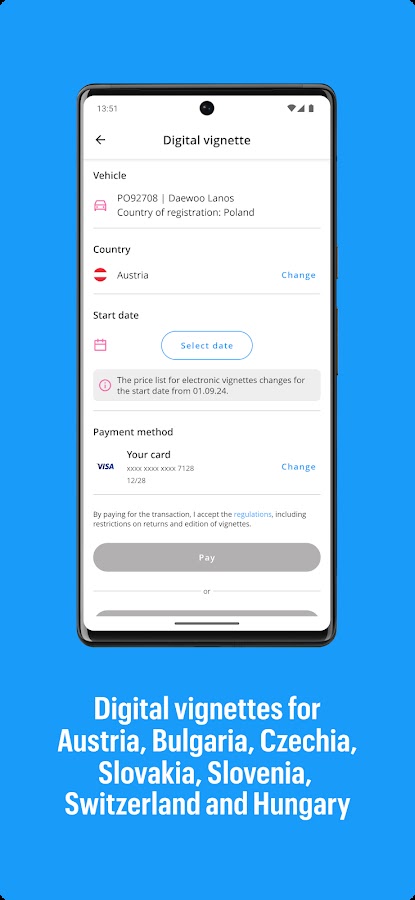 Приложение Autopay позволяет приобретать виньетки для таких стран, как Австрия, Болгария, Швейцария, Чехия, Словакия, Словения и Венгрия. Просто войдите в свою учетную запись, выберите страну, в которую вы путешествуете, выберите количество дней и подтвердите оплату. Виньетка (в формате .pdf) будет отправлена на ваш электронный ящик. Вам даже не нужно его распечатывать — просто покажите его на экране телефона во время возможной проверки.