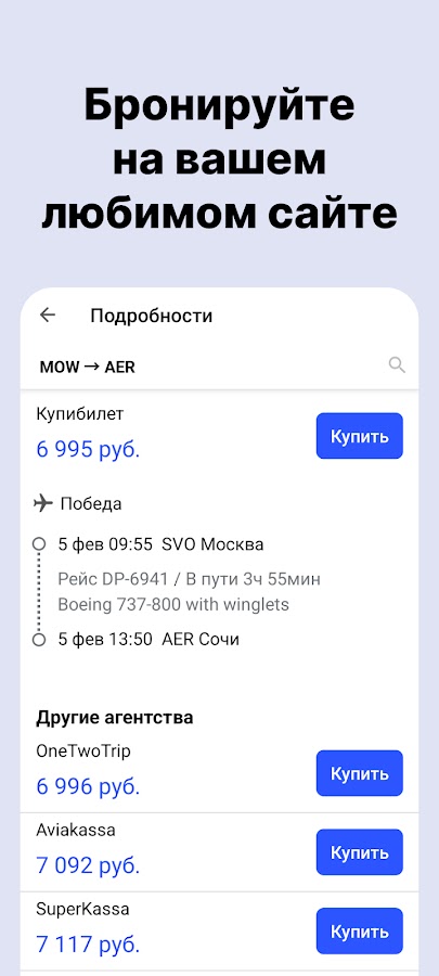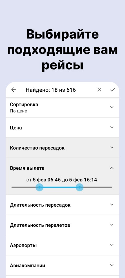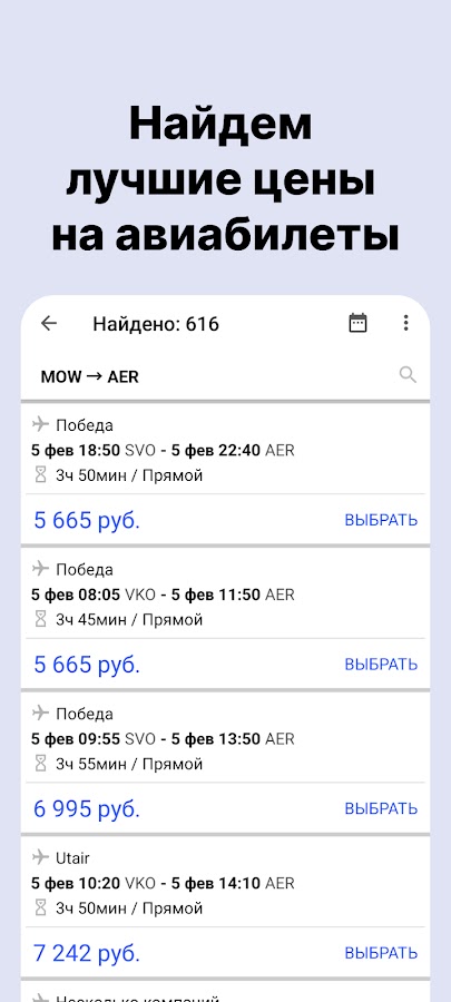 Приложение «Авиабилеты» полностью бесплатно, экономит не только ваши деньги, находя выгодные цены на авиабилеты, но и ресурсы вашего смартфона — в приложении нет рекламы, посторонних сервисов и сбора персональных данных. Только поиск авиабилетов и ничего лишнего.