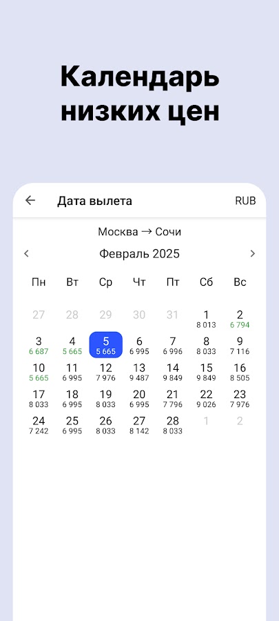 — Укажите тип маршрута (в одну сторону, туда и обратно, составной маршрут) и даты путешествия. В календаре, для удобства, будут отражены примерные цены авиабилетов на каждый день.