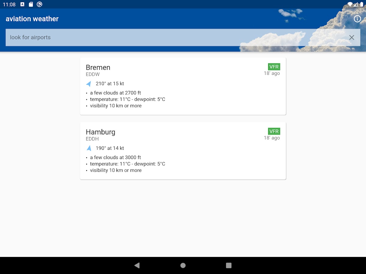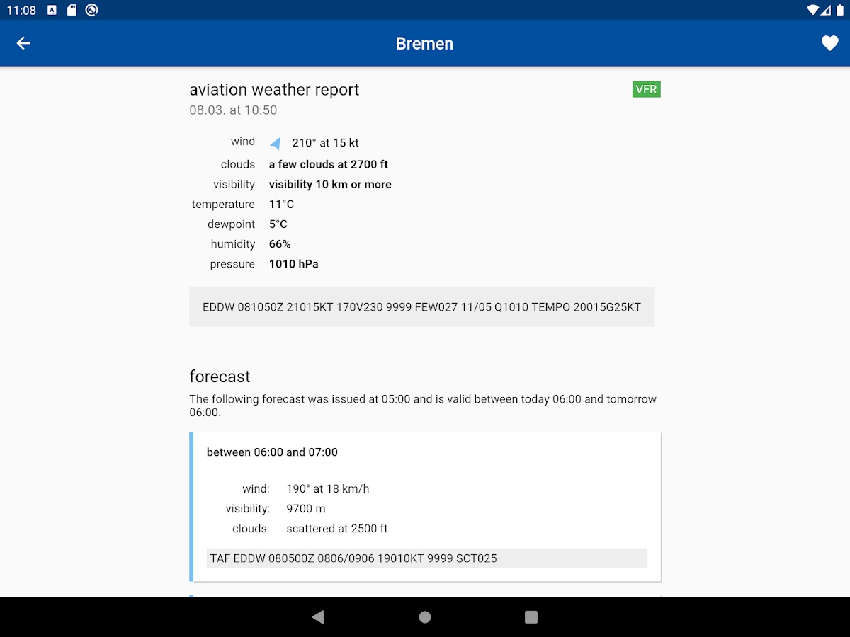 Приложение авиационной погоды позволяет быстро и надежно вызывать местные и глобальные авиационные метеорологические сводки. Сообщения METAR и TAF отображаются в декодированной форме. Отдельные станции можно сохранять в списке избранных. Все блоки настраиваются в настройках и могут быть адаптированы к вашим потребностям.