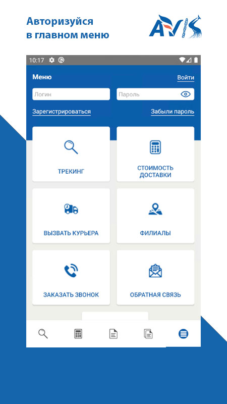 В приложении Avis Logistics ряд функции доступны без регистрации, В разделе «Трейсинг» вы сможете быстро отследить, где ваша посылка, когда она прибудет в ваш город, сколько она весит. В разделе “Филиалы” вы сможете узнать точный адрес и телефоны и график работы. В Разделе «Стоимость доставки», вы сможете быстро узнать стоимость и сроки отправления, выбрать самый выгодный тариф. В разделе «Вызвать курьера» для забора посылки, Вы минуя звонок оператору, сами выбираете день и время забора груза (согласно рабочего графика офиса). в Разделе «Заказать звонок» и «Обратная связь», вы можете выбрать любую из предоставленных тем, и мы в кратчайшие сроки Вам ответим.