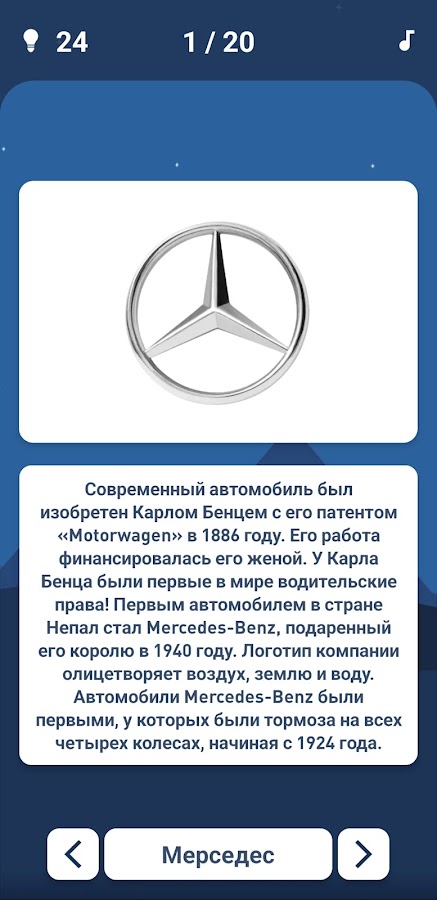 «Угадай логотип автомобиля» — это не только игра-викторина по логотипу, но и автомобильная игра, в которой вы сможете узнать больше об истории и особенностях различных марок автомобилей. Для каждого угаданного вами логотипа вы получите несколько интересных фактов и мелочей об автомобильной компании, таких как ее происхождение, основатель, слоган, самая продаваемая модель и многое другое. Вы также увидите потрясающие изображения автомобилей, которые заставят вас пускать слюни!