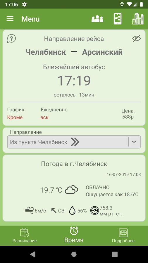 Приложение находит и отсчитывает время до ближайшего автобуса.