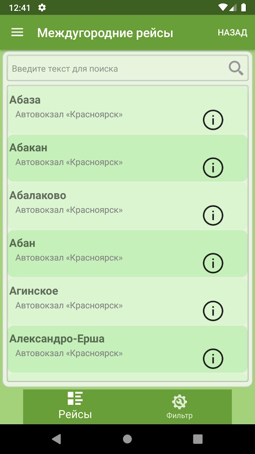 Красноярское расписание междугородних автобусов без карт и оффлайн.