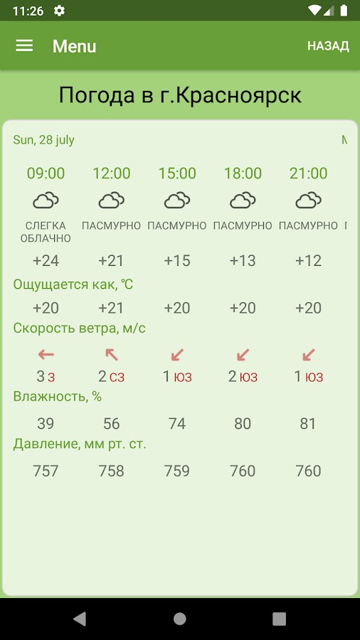4)Прогноз погоды на сутки и прогноз погоды на 5 дней.