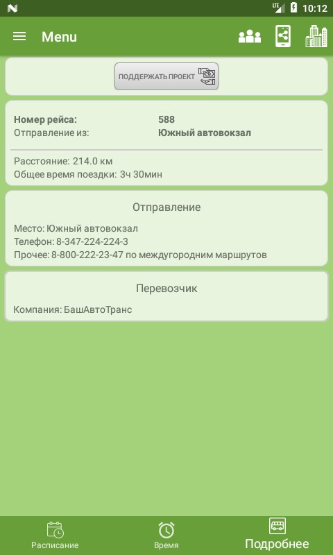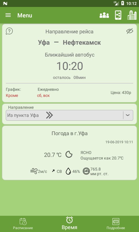 Приложение находит и отсчитывает время до ближайшего автобуса.