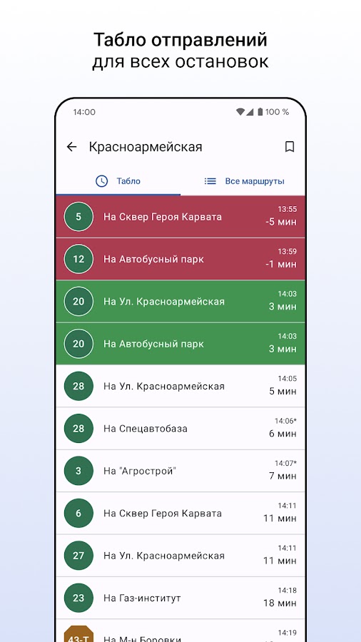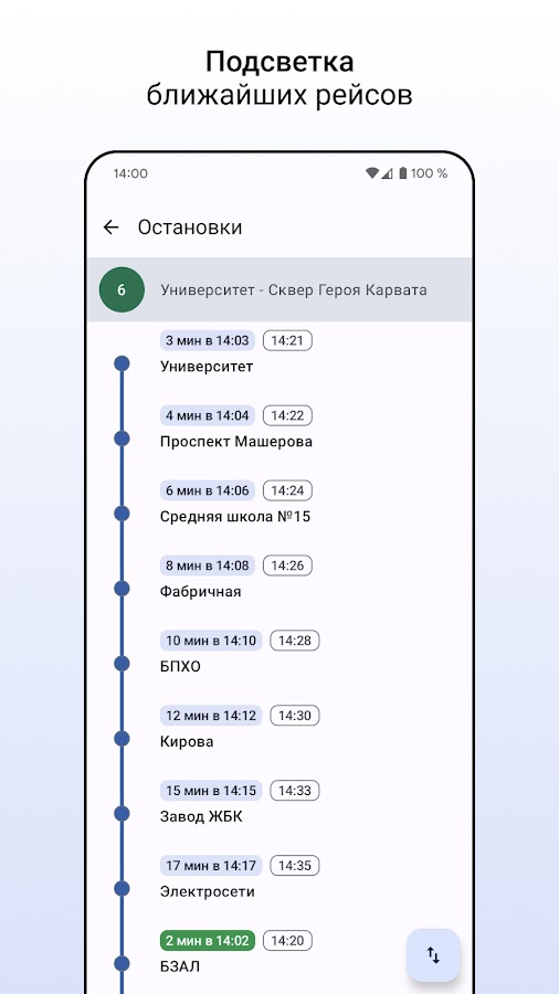 Нужно узнать время прибытия ближайшего рейса на конкретную остановку? Нажмите на маршрут – приложение откроет список остановок с временем прибытия ближайшего транспорта.