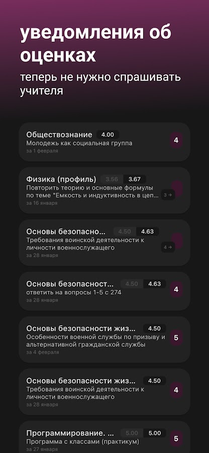 Следите за успеваемостью с помощью уведомлений, которые будут показаны каждый раз, когда учитель выставит или изменит вам оценку!