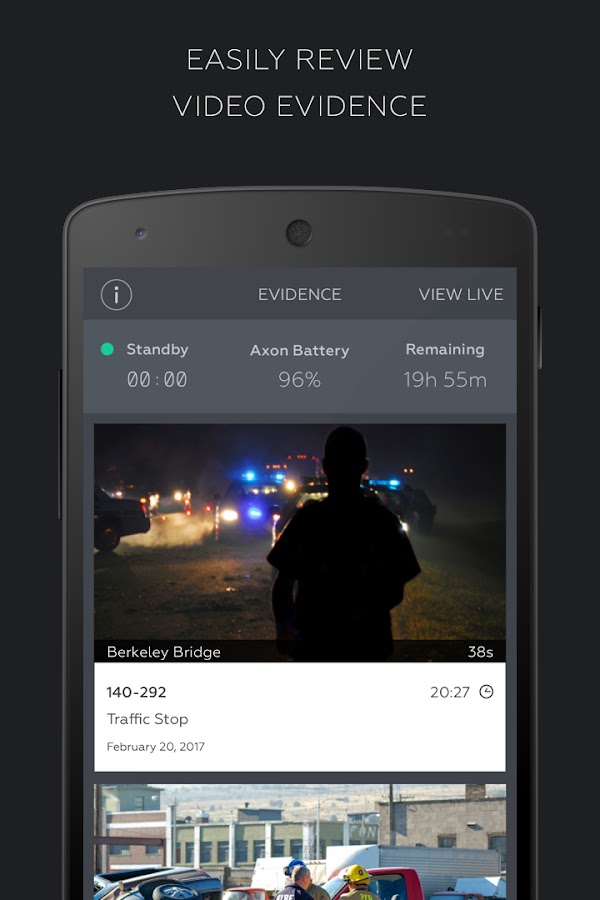 Axon View сочетается с служебными видеокамерами Axon Flex, Axon Body, Body 2 и Body 3 от Axon Enterprises, чтобы обеспечить расширенные рабочие процессы и обеспечить просмотр записанных видео в полевых условиях. Это приложение позволяет пользователю просматривать прямой эфир с камеры для настройки поля зрения, просматривать список всех видео, хранящихся в настоящее время на устройстве, и просматривать эти видео.