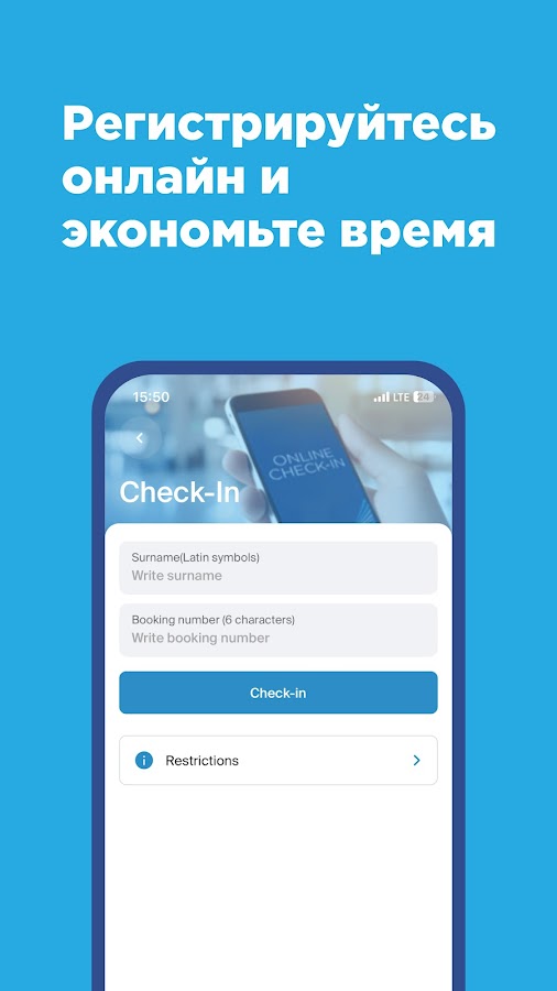 • Предварительная регистрация — Выиграйте время, зарегистрировавшись до прибытия в аэропорт. Предъявитt QR-код и получитt свои билеты в короткий срок.