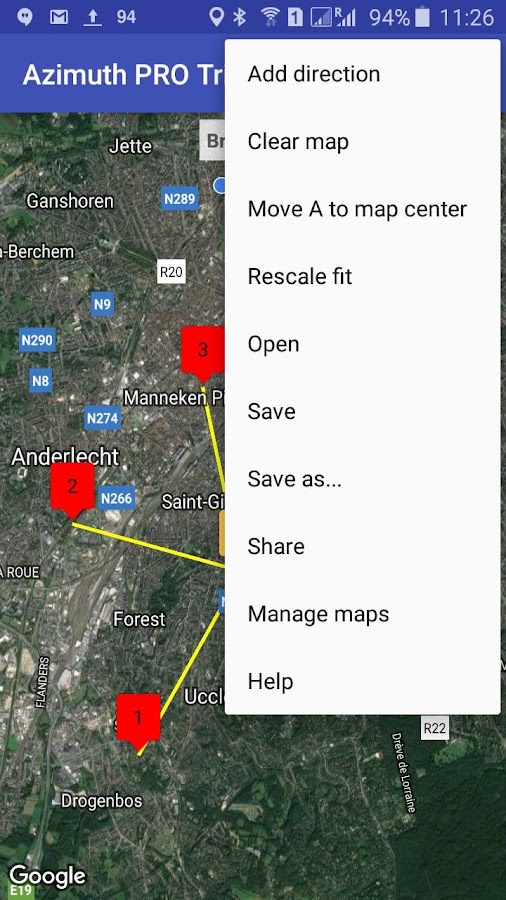 — Выберите «Добавить направление» из меню будет провести линию в направлении 62 ° по умолчанию. Длительное нажатие + Drag’n падение на удаленном конце, чтобы изменить направление, или коротко нажмите и ввода азимута.