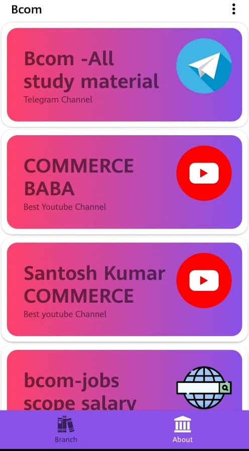 Bcom — это образовательное приложение, в котором студенты Bcom могут читать множество заметок и получать информацию о программе bcom, информации о курсах, вопроснике, электронной книге, связанной с курсом bcom, колледжем, программой bcom и т. д.