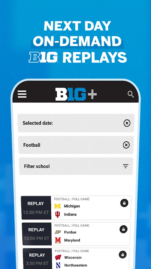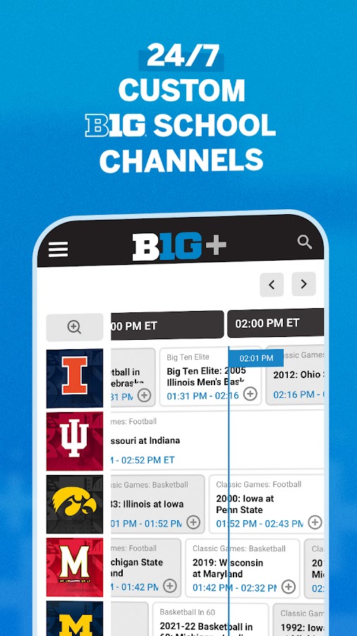 B1G+ включает в себя готовые на следующий день архивы всех игр и событий, созданных B1G+, а также транслируемых по телевидению игр и событий, созданных Big Ten Network и медиа-партнерами Big Ten Conference, включая FOX, FS1, ABC, ESPN, NBC и CBS. Если вы пропустили вчерашнюю игру B1G, вам будет предоставлена подписка B1G+.