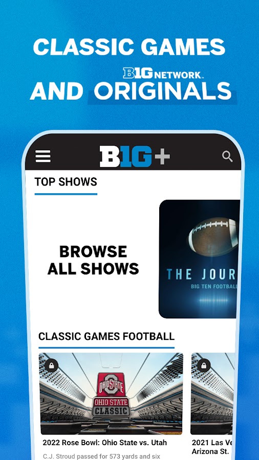 B1G+ включает доступ по требованию к обширной библиотеке оригинальных программ Big Ten Network и классических игр. Переживите самые невероятные игры своей любимой школы заново! Или транслируйте предыдущие сезоны популярных шоу Big Ten Network, таких как «Путешествие», «Момент B1G» и «История B1G».