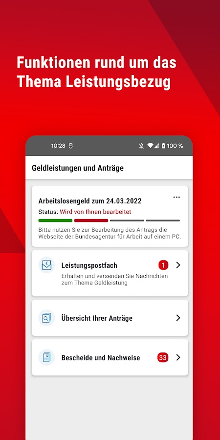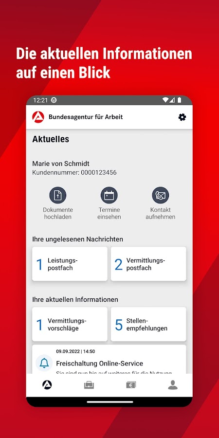 Вы можете в любой момент просмотреть свои сообщения в почтовом ящике льгот и трудоустройства и, помимо прочего, обратиться в Федеральное агентство по трудоустройству по вопросам денежных пособий и консультаций и трудоустройства.