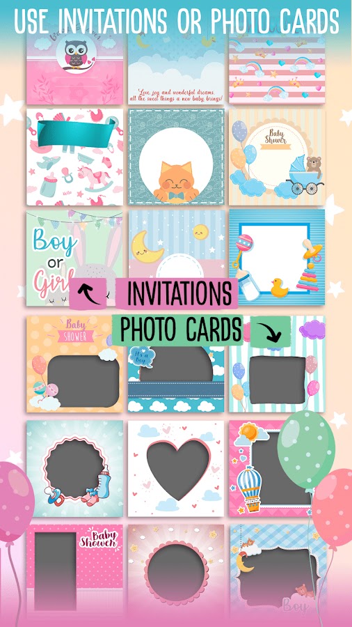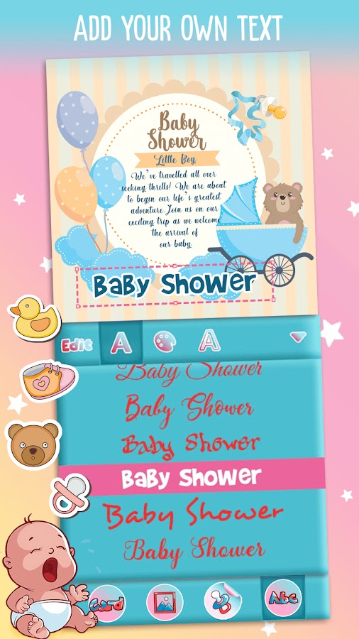 приложения Приглашение На Бэби Шауэр удобен в использовании, что делает его простым в использовании для всех. Это самая милая бэби шауэр пригласительная открытка приложения с фотонаклейками и рамками. Наслаждайтесь использованием этого бэби шауэр производителя карточек с текстом на фото-кавычках! Выберите фотографии или красивые фоны в “приглашения на вечеринку шаблоны” и поместите текст со шрифтом и стилем. Сделайте редактируемое бэби шауэр приглашение. Откройте свою селфи-камеру, сделайте снимок, поместите “приглашения на вечеринку”, напишите цитаты и добавьте стикеры. Скачать этот красивый “фон для приглашений”. Редактировать картинки с созданием приглашения приложения.