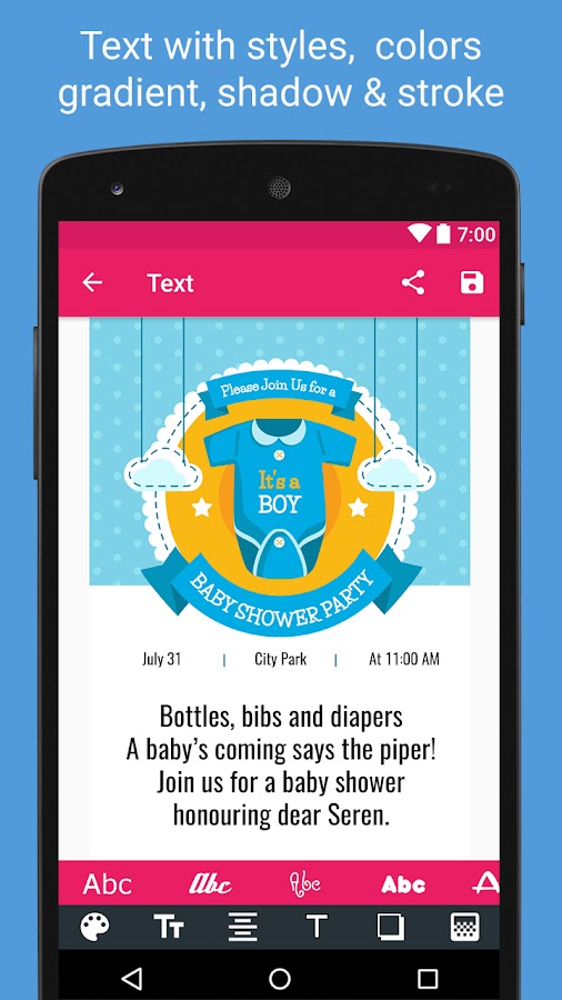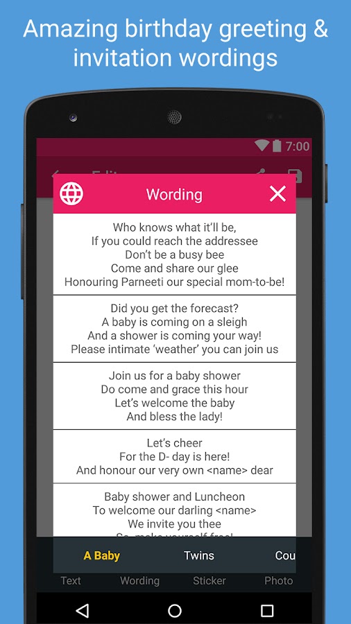 Пригласите всех своих родственников и друзей на прием ребенка. Используйте это приложение, чтобы создать несколько удивительных карт, чтобы пригласить всех близких в день принятия душа ребенка. Выберите любую вашу любимую карточку из множества различных красивых вариантов выбора карты. Используйте различные функции редактирования, чтобы сделать его более привлекательным и красивым.