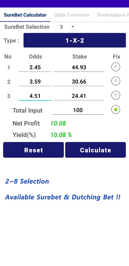 Этот калькулятор Surebet определяет различные стратегии арбитража.