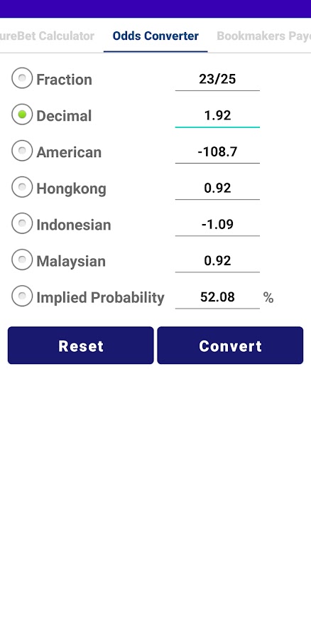 Калькулятор шансов позволяет вставлять свои коэффициенты и автоматически преобразовывать их в американские, десятичные и дробные коэффициенты.