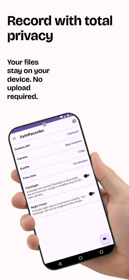 SafeRecorder – это приложение для камеры, созданное для удобной видеозаписи даже при заблокированном или выключенном экране. Запись всегда начинается только после прямого действия пользователя.