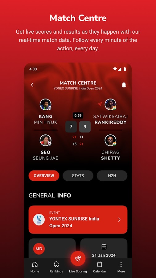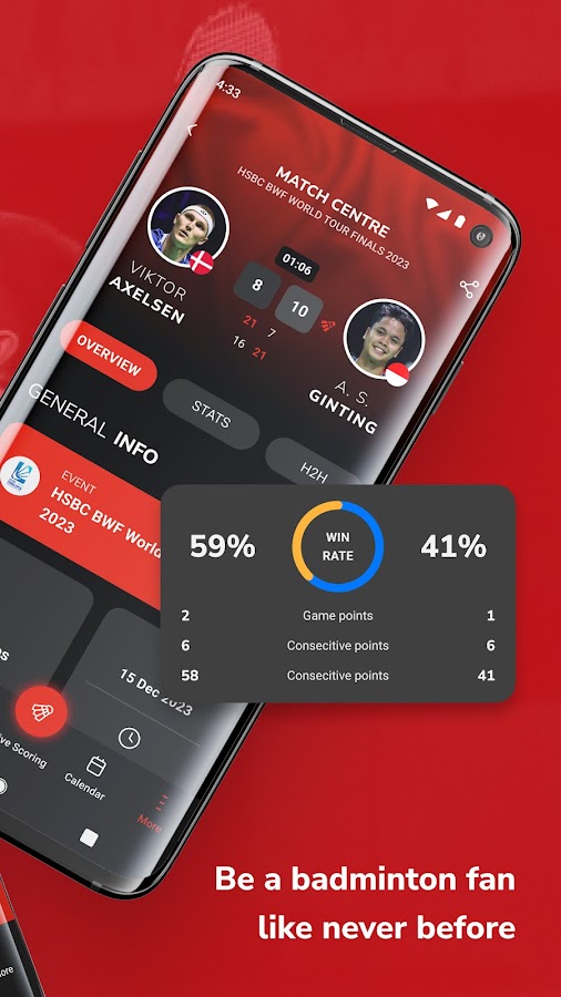 Следите за своими любимыми профессиональными игроками в бадминтон и турнирами в режиме реального времени на протяжении всего сезона, включая мировой тур HSBC BWF и крупные чемпионаты.