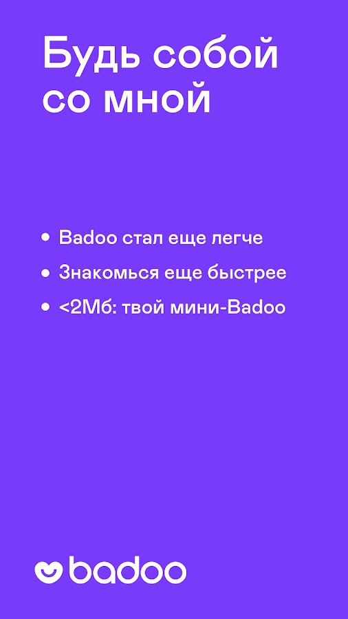 Первый шаг – самый сложный? Только не с Badoo Lite! Просматривай профили и ставь лайки, даже если ты офлайн. Выбирай, с кем продолжить знакомство: никто не может написать тебе больше двух сообщений, пока ты не ответишь. Badoo Lite – это еще больше общения в компактной упаковке.
