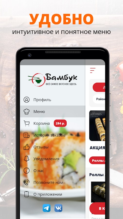 Приложение Бамбук | Астрахань — это удобный способ заказа еды домой или в офис. Всегда в нашем меню — оригинальные роллы и суши, вкусная пицца, салаты, вок, напитки в ассортименте. Еженедельные акции и скидки!