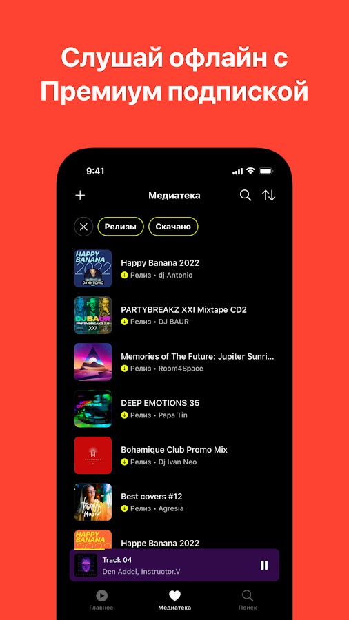 • Добавление понравившихся релизов, треков и плейлистов редакции к себе в медиатеку;