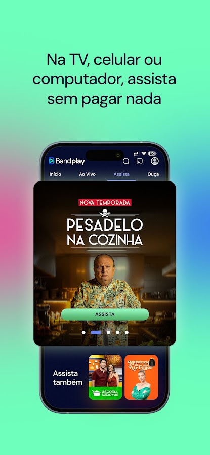 Всё, что выходит на Bandplay, здесь! Смотрите и пересматривайте ваши любимые шоу когда и где угодно: Masterchef, Melhor da Tarde, Os Donos da Bola, Jogo Aberto, а также новостные программы и радиостанции от Grupo Bandeirantes. На Bandplay вы сами управляете программами!