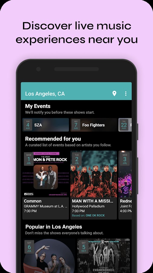 Скачайте приложение Bandsintown Concerts для Android бесплатно - последняя версия (10.0.6) уже доступна для установки на ваш телефон или планшет.