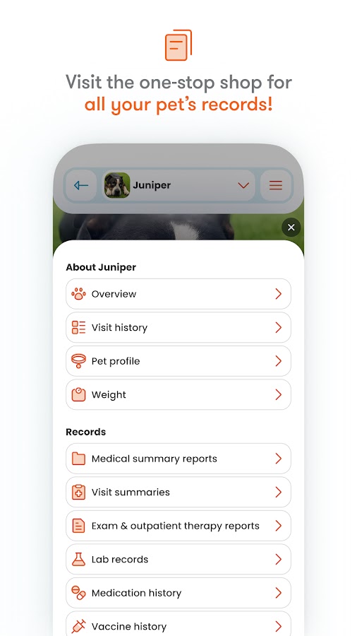 — Просматривайте и скачивайте ветеринарные карты вашего питомца, включая историю лечения, информацию о вакцинации, лекарствах, лабораторных анализах, выписки о визитах и счета.