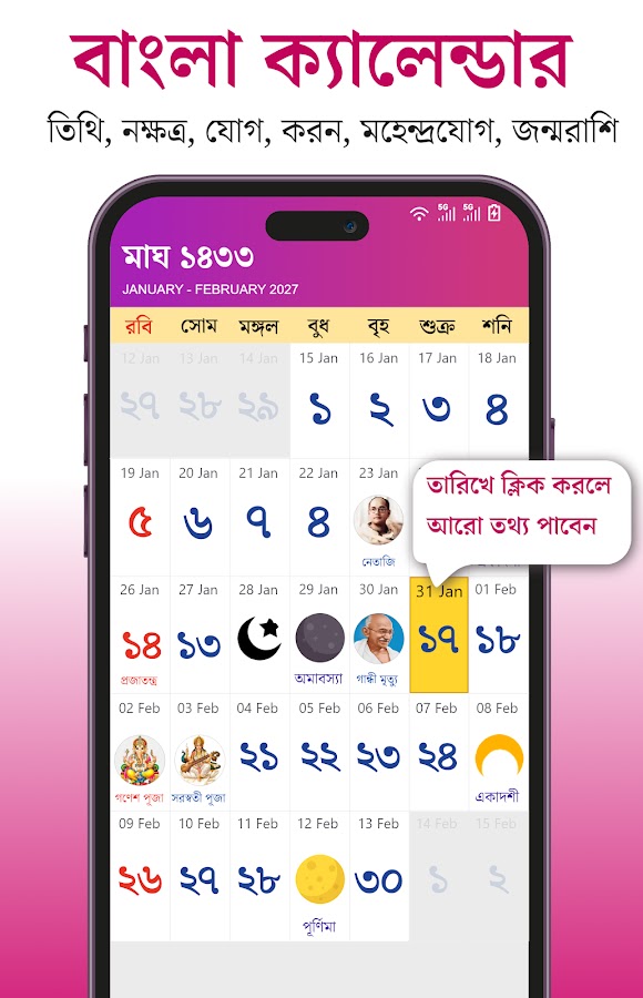 Новый год в бенгальском календаре доступен всего в один клик. Вы можете увидеть текущую дату на бенгальском языке, как только нажмете на календарь. Этот бенгальский календарь на 2026 год подходит как для Индии, так и для Бангладеш. Вам не понадобятся разные календари, если вы индиец или бангладешец.