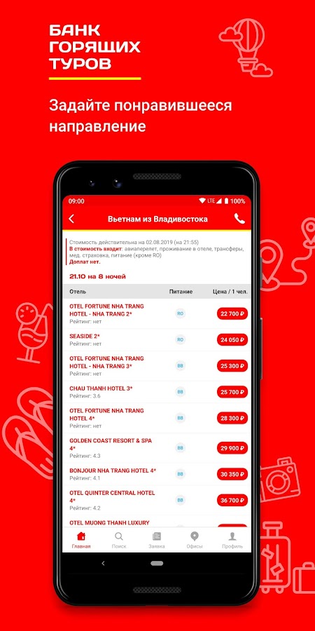 Бесплатное приложение Банк Горящих Туров показывает честные цены без скрытых доплат. В стоимость тура всегда входит: авиаперелет, проживание в выбранном отеле, питание, трансфер и мед. страховка и топливный сбор.