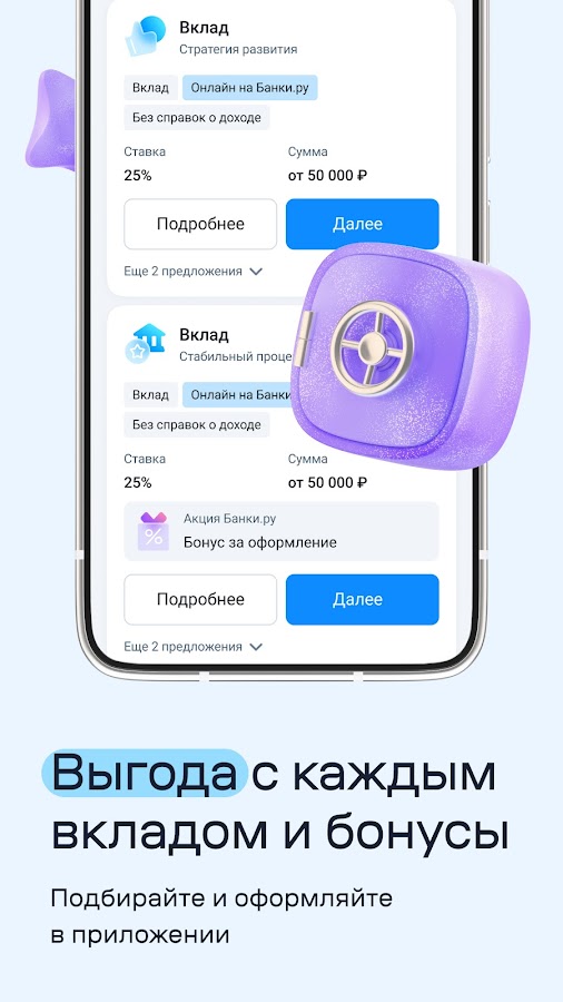 При помощи Банки.ру вы за пару минут поймете, в каком банке стоит открыть вклад и куда вложить деньги. Приложение подскажет варианты с лучшими процентами (максимальными и минимальными среди представленных в приложении продуктов) и поможет рассчитать потенциальную доходность по сделке.