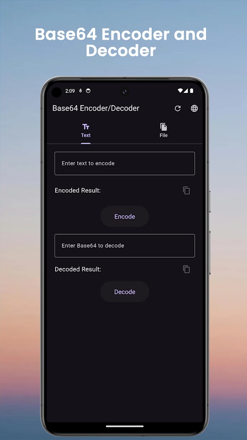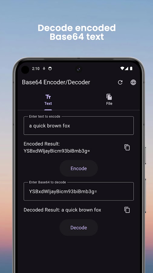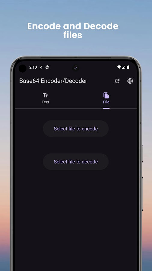 Многоплатформенная обработка файлов. Благодаря встроенной поддержке средства выбора файлов вы можете легко кодировать или декодировать любой файл непосредственно из хранилища вашего устройства. Выберите файлы, конвертируйте их и без труда сохраните обратно на свое устройство. Независимо от того, работаете ли вы с документами, изображениями или другими медиафайлами, наше приложение обеспечивает плавную обработку данных.