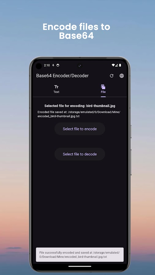 Кодирование/декодирование файлов: выберите файл, который хотите обработать, с помощью встроенного средства выбора файлов. Затем приложение закодирует или декодирует файл и позволит вам сохранить результаты на вашем устройстве.