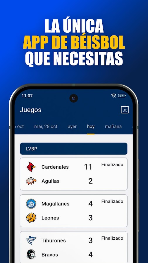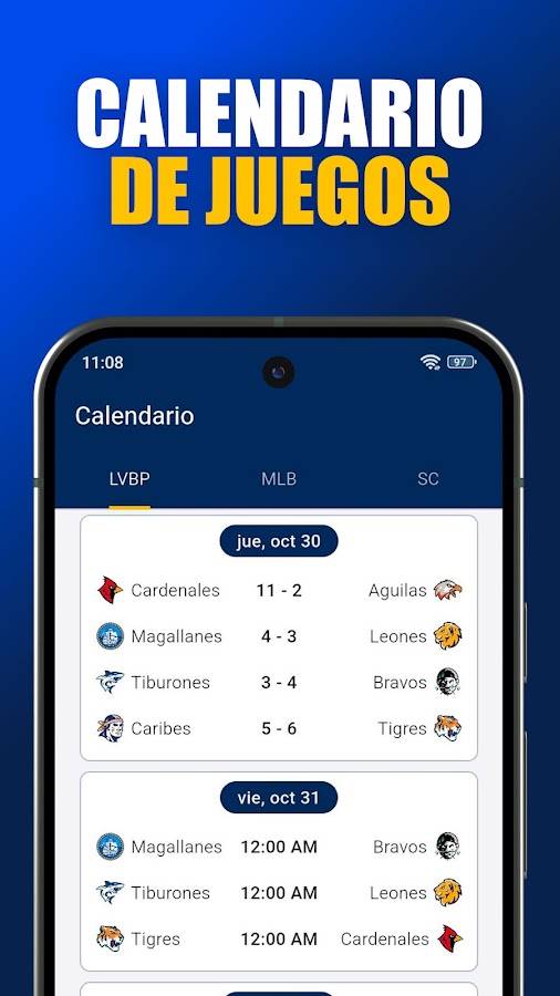 ⚾️ Счёт в режиме реального времени: следите за каждым матчем LVBP и MLB от питча к питчу. Счёт обновляется мгновенно, так что вы не пропустите ни одной гонки.