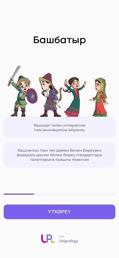 Башбатыр – это мультимедийное интерактивное электронное учебное издание в виде мобильного приложения для изучения учебного предмета «Родной (башкирский) язык» в качестве дополнительного материала к учебникам для общеобразовательных организаций с родным (башкирским) языком обучения.