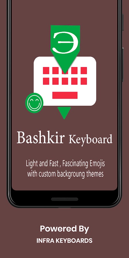 Bashkir Keyboard от Infra позволит вам печатать на башкирском языке, а также текст на английском языке с наиболее привлекательными эмодзи