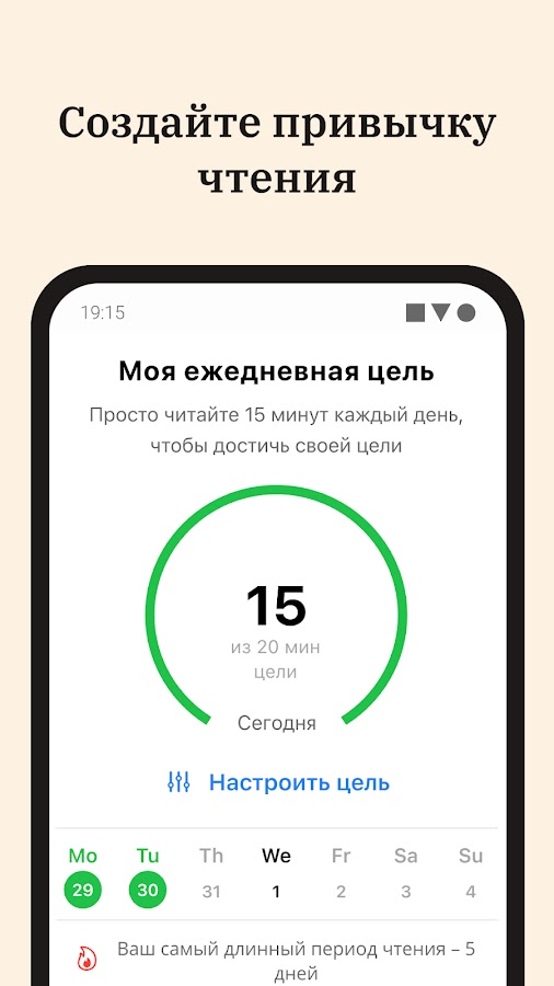 После того, как Вы зададите годовую цель, приложение предложит дневную норму минут чтения, необходимую для ее достижения. Вы забывчивы? Не волнуйтесь, мы подготовили ненавязчивые напоминания, которые помогут Вам поддерживать темп. Каждый раз, когда Вы будете достигать цели, мы будем радоваться вместе с Вами!