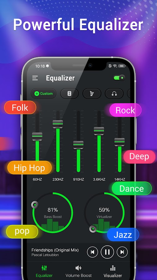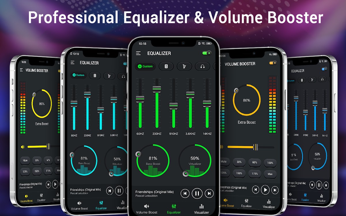 Эквалайзер и усиление басов помогают улучшить качество звука музыки и видео с помощью визуализатора, эквалайзера, усиления басов, усиления громкости и эффектов 3D-виртуализации.